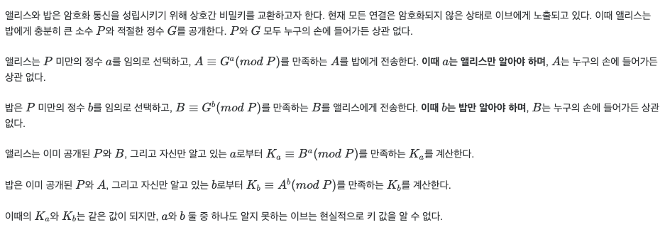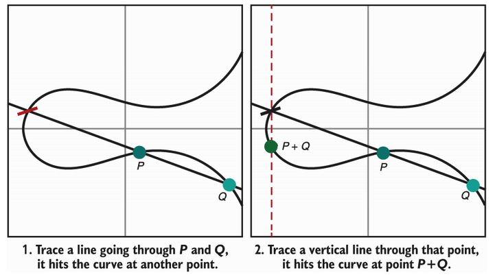 ECDH 키교환은 타원곡선을 사용한다. P 와 Q 가 서로 키교환을 한다고 가정해보자. P 와 Q 를 이은 직선과 타원곡선이 만나는 점 (P+Q) 에서 수직선을 그어, 타원곡선과 만나는 점을 선택한다. P+Q 만으로는 P 와 Q 의 값을 알 수 없지만, P 와 Q 는 각자의 좌표를 알고 있기 때문에, 서로의 좌표를 알 수 있다. 다시 말해, P+Q 와 P 를 알면 Q 를 추론해낼 수 있다. 반대로, P+Q 만 안다고 했을 때, P 와 Q 를 도출해 내는 것은 매우 어렵다.