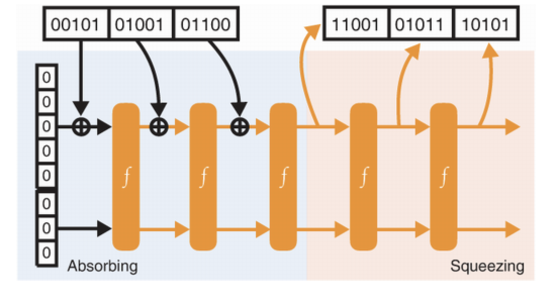 SHA-3 스펀지 로직에서는 반복하여 순열 함수를 호출하는 과정을 absorb, digest 를 구하는 과정을 squeeze 라고 부른다.