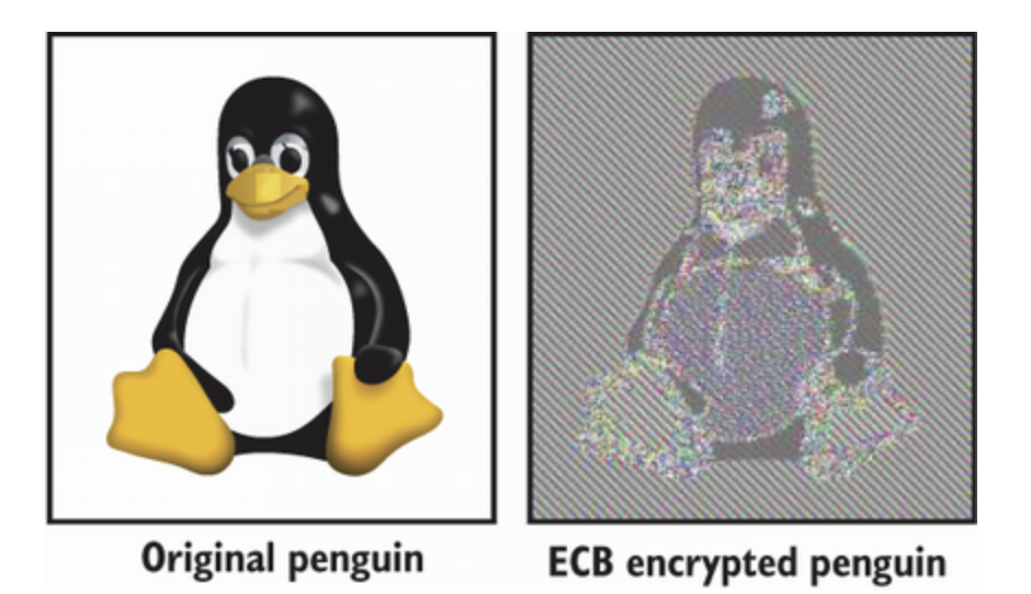 ECB Penguin. IV 값을 통해 암호문을 랜덤화하지 않는다면, 암호화 로직의 경향성을 추론할 수 있다.