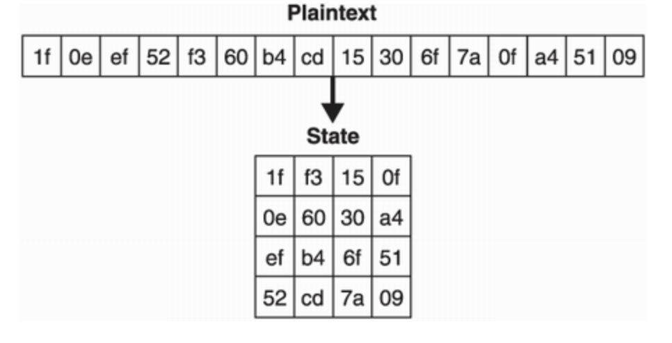 내부적으로는, AES 암호화는 4*4 바이트의 이중 배열로 평문을 암호화한다.