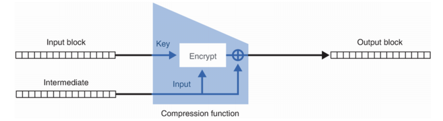- 해시하려는 입력에 패딩을 적용한 다음, 다음 입력을 압축 함수에 맞는 블록으로 자른다. 만약 블록 크기보다 데이터의 크기가 작다면, 패딩을 통해 특정 바이트를 추가한다.