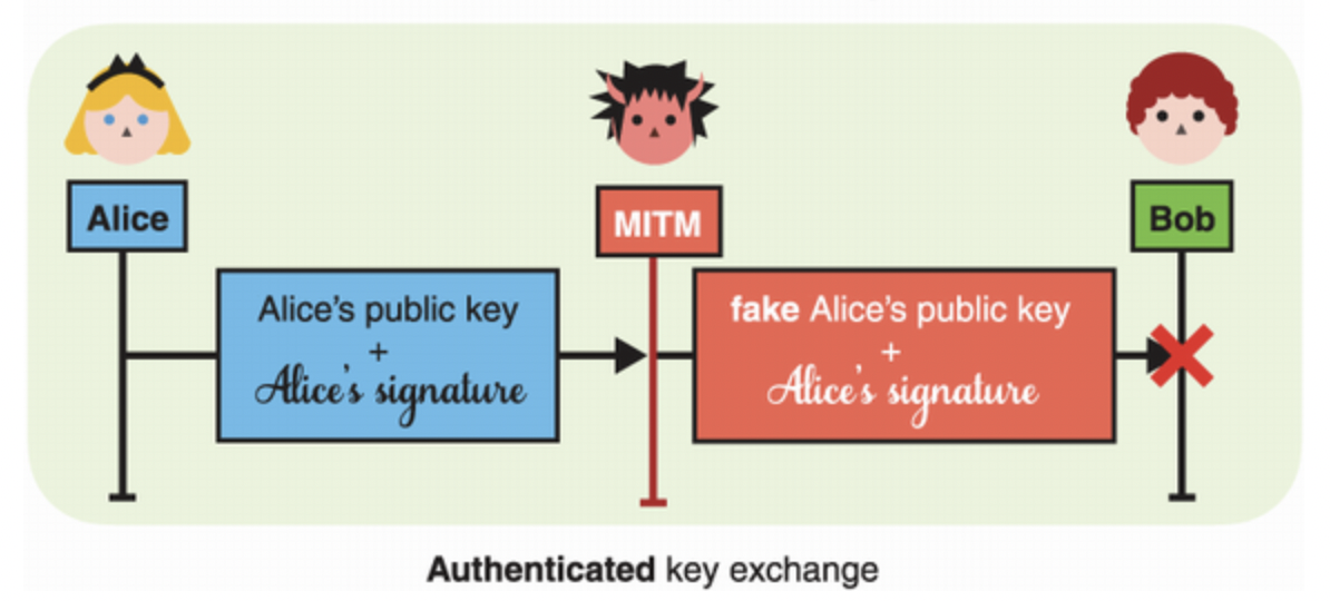 인증된 키 교환. 각자가 공개키에 대한 서명 과정을 거쳤으므로, MITM 이 중간에 메시지를 변조해도 알아차릴 수 있다.