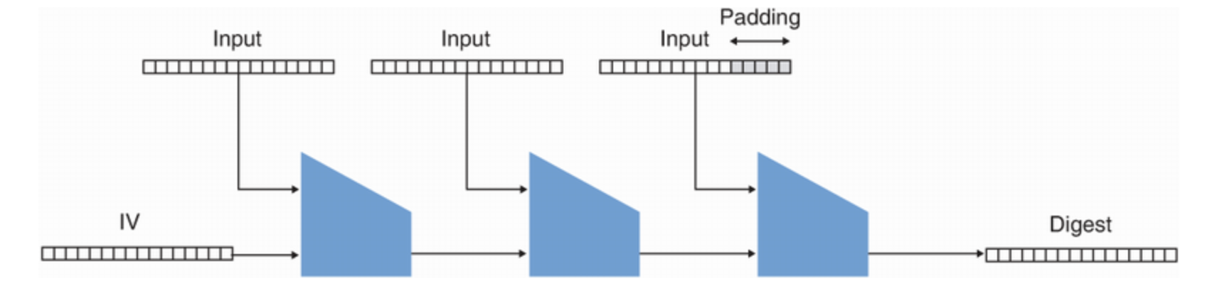 - (1) 의 출력을 압축 함수의 두 번째 인수로 사용하여 압축 함수를 메세지 블록에 반복적으로 적용한다. 다만, 첫 번째 압축의 경우, 압축 함수의 인자가 하나밖에 없는데, 이를 위해 초기화 벡터(IV) 를 추가한다.