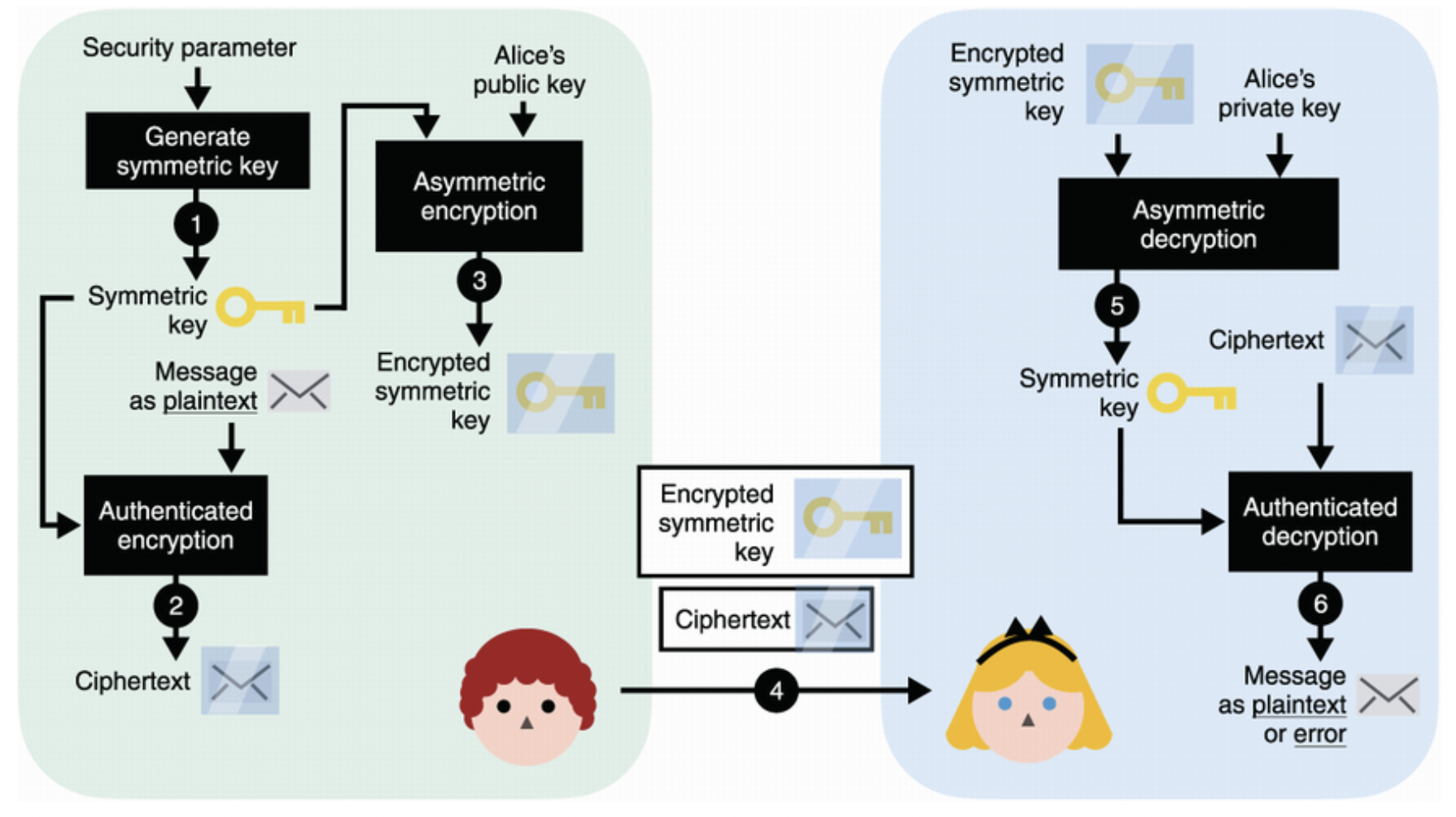 대칭키를 비대칭 암호화를 통해 암호화한 후, 공개키와 함께 전달한다. 복호화할 때에는 비대칭키 복호화를 통해 대칭키를 구한 후, 구한 대칭키로 암호문을 복호화한다.