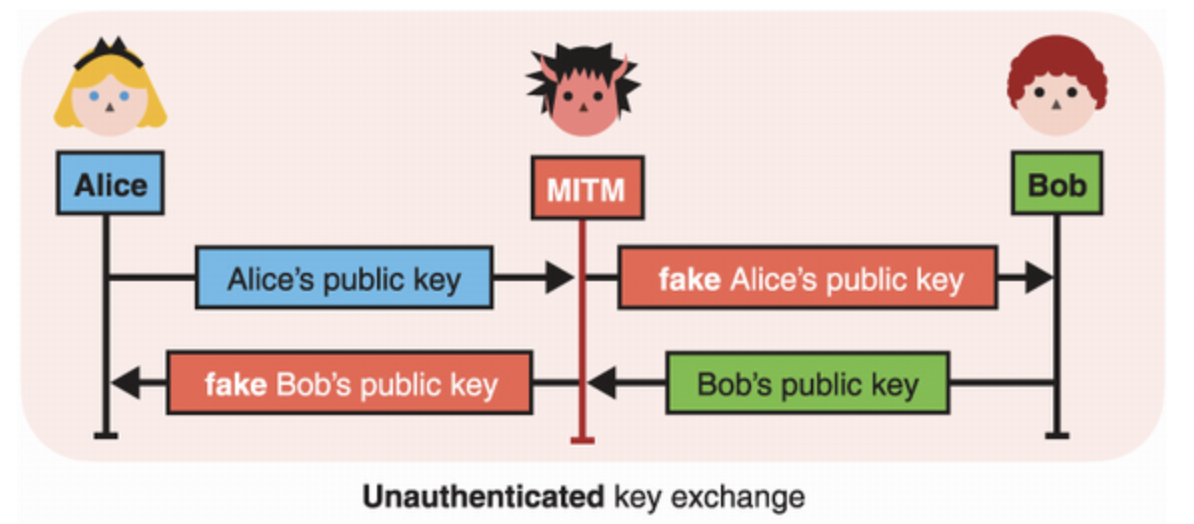 인증되지 않은 키 교환. MITM 의 본인이 생성한 공개 키를 양 쪽의 키 교환에 사용한다면, 앨리스와 밥의 메세지를 모두 복호화할 수 있게 된다.
