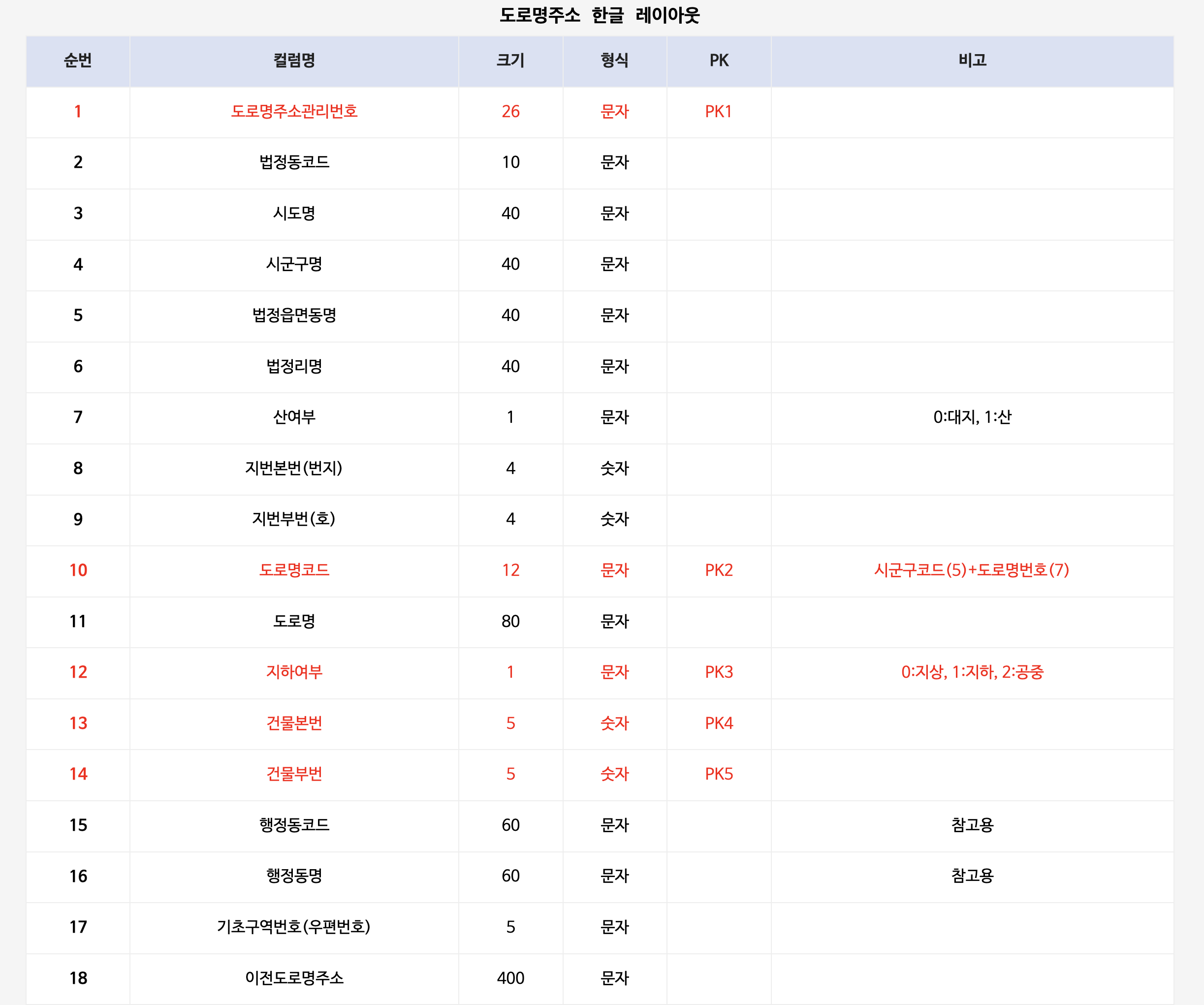 배치에서 대량의 데이터를 다운로드받아, RDBMS 에 저장하는 배치 시스템을 개발해야 하는 일이 생겼다. 기가 단위의 텍스트 파일을 다운로드 받아, rx.js 파이프라인과 BullMQ 메세지 큐를 사용하여 약 700만 건의 데이터를 적재하는 작업이었다. 다운로드 받아야 하는 텍스트 파일의 크기 자체가 크다 보니, 파일을 다운로드하고 읽을 때에도 Node.js 의 Stream 기능을 이용하였다. 다운로드 하려는 파일은 주소기반산업지원서비스에서 공개하는 주소 데이터인 "도로명주소 한글" 데이터 파일이다. 파일의 데이터 형식은 다음과 같다.