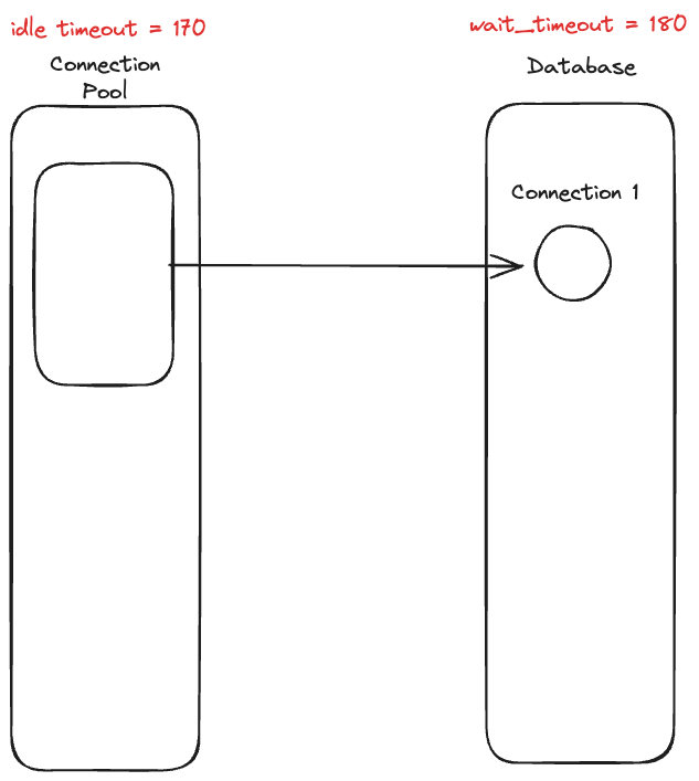 아까와 동일한 상황이지만, Connection Pool 의 idle timeout 만 170초로 변동된 상황이다. 동일하게 서버 트래픽이 없어 Database Connection 에도 요청이 없는 경우, Connection 들은 Sleep 상태가 된다. 만약 Sleep 상태가 된 후 idle timeout(170초) 만큼의 시간이 지날 경우, Connection Pool 은 Database Connection 자원을 반납한다.