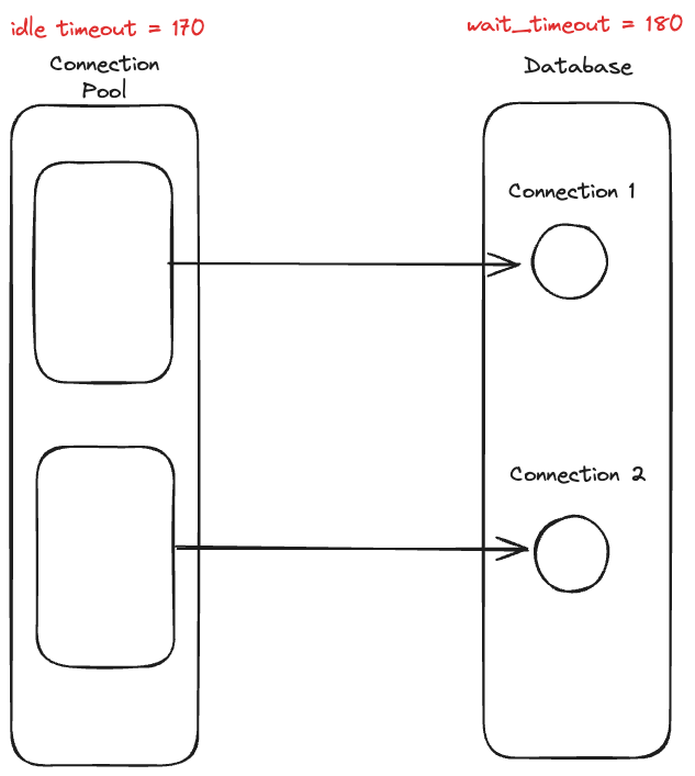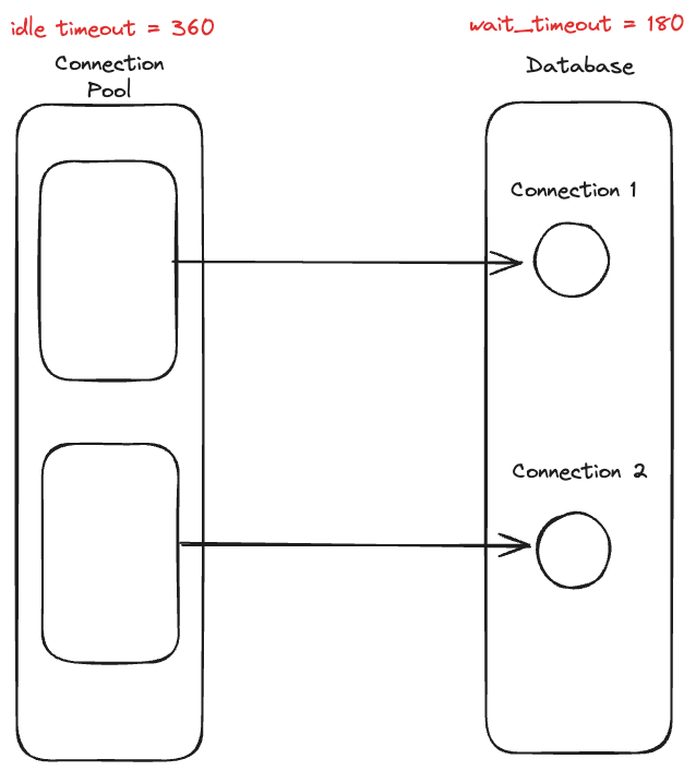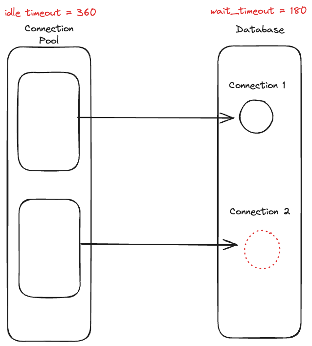 예를 들어, 다음과 같은 상황을 가정해 보자. Connection Pool Size 가 2인 상황에서, 기본적으로 Connection Pool 은 Database Connection 2개를 소유하고 있다. Connection Pool 의 idle timeout 은 360초이고, MySQL 의 wait_timeout 은 180초이다.