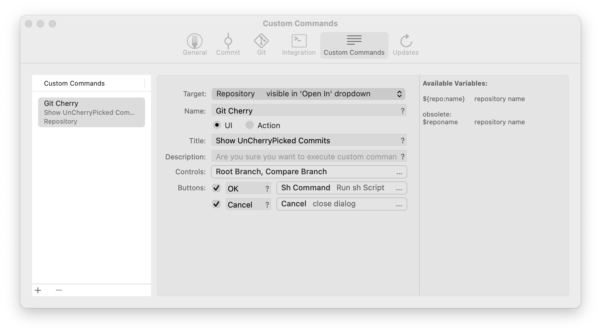 개인적으로 개발을 하며 필요한 Git 의 기능들을 Fork 에서는 대부분 제공한다. Commit, Branch 관련 기본적인 기능들은 물론 Cherry Pick, Interactive Rebase, History, Blame 등 일반적인 상황에서 필요한 기능들을 편리한 UI 로 제공한다. 다만 속해있는 팀 / 작업해야 할 저장소의 특성에 따라 특수하게 필요한 기능들이 존재한다. 나의 경우에는 git cherry 명령어가 그러한 기능이었다. Fork 는 사용자가 정의한 Custom 기능들을 UI 를 통해 실행할 수 있는 "Custom Commands" 라는 기능을 제공한다.