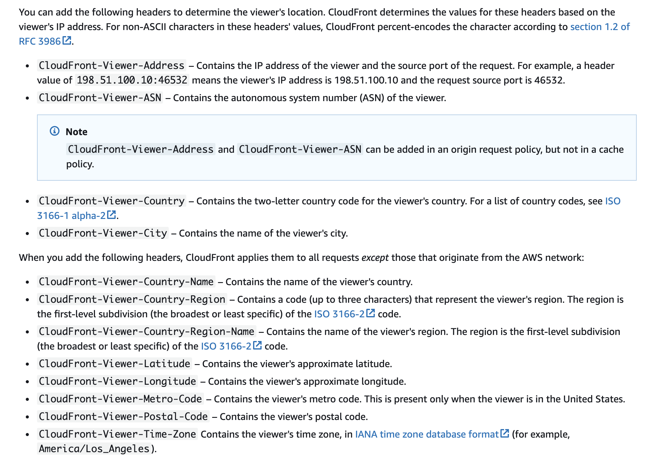 그러던 도중, HTTP 요청 헤더에서 유의미한 정보를 얻을 수 있었다. Amazon Cloudfront 문서 를 확인해 보면, 요청을 보낸 유저의 위치 정보를 대략적으로 확인할 수 있다.