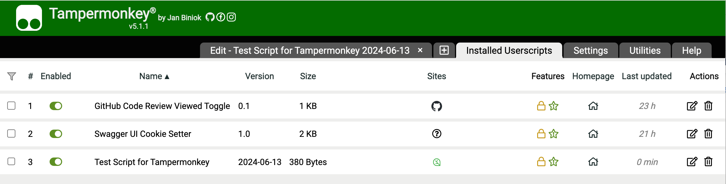 | @name | (중요) 스크립트 이름 | // @name Test Script for Tampermonkey |