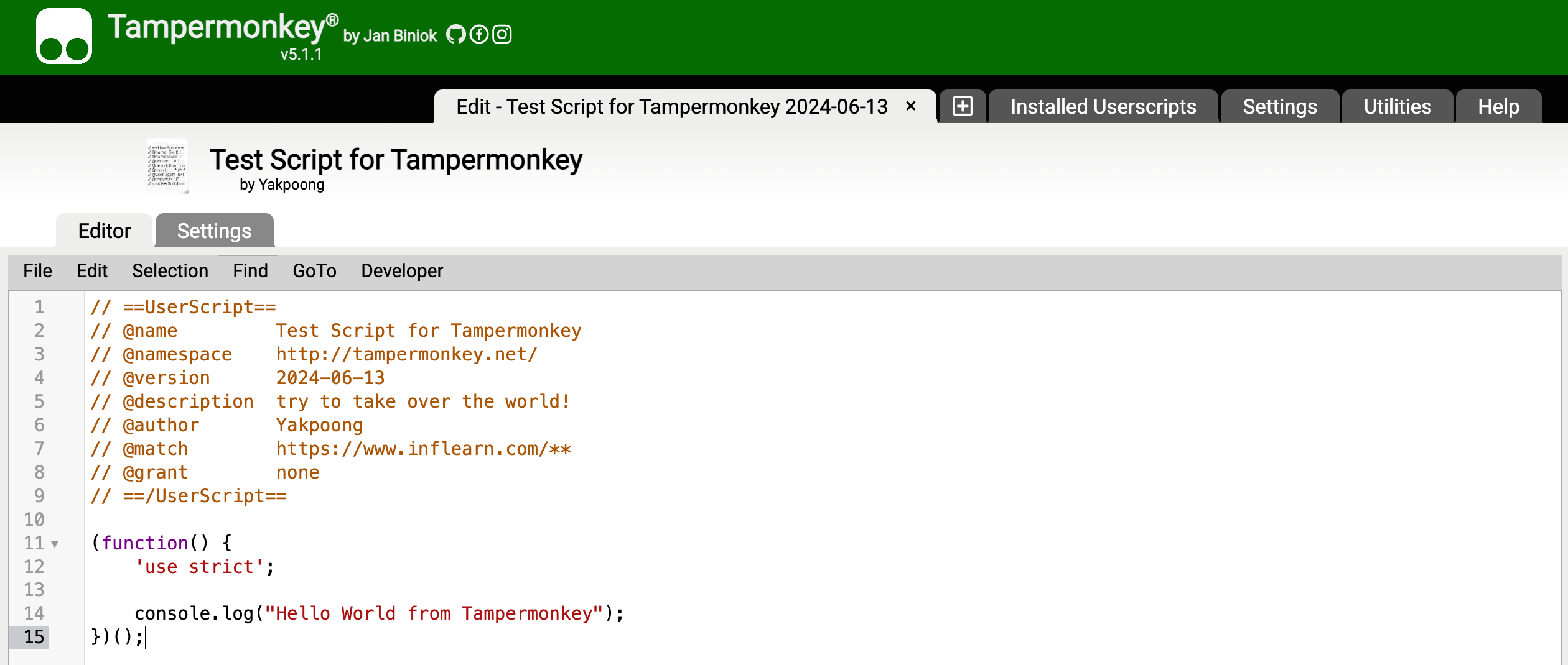 이 스크립트의 실질적인 코드는 console.log 로 메세지를 출력해 주는 간단한 스크립트입니다. 하지만, Tampermonkey 에서는 상단에 있는 ==UserScript== 부분이 메타데이터를 표시해 주는 역할을 합니다. UserScript 에 표기할 수 있는 메타데이터 정보를 알아보겠습니다.