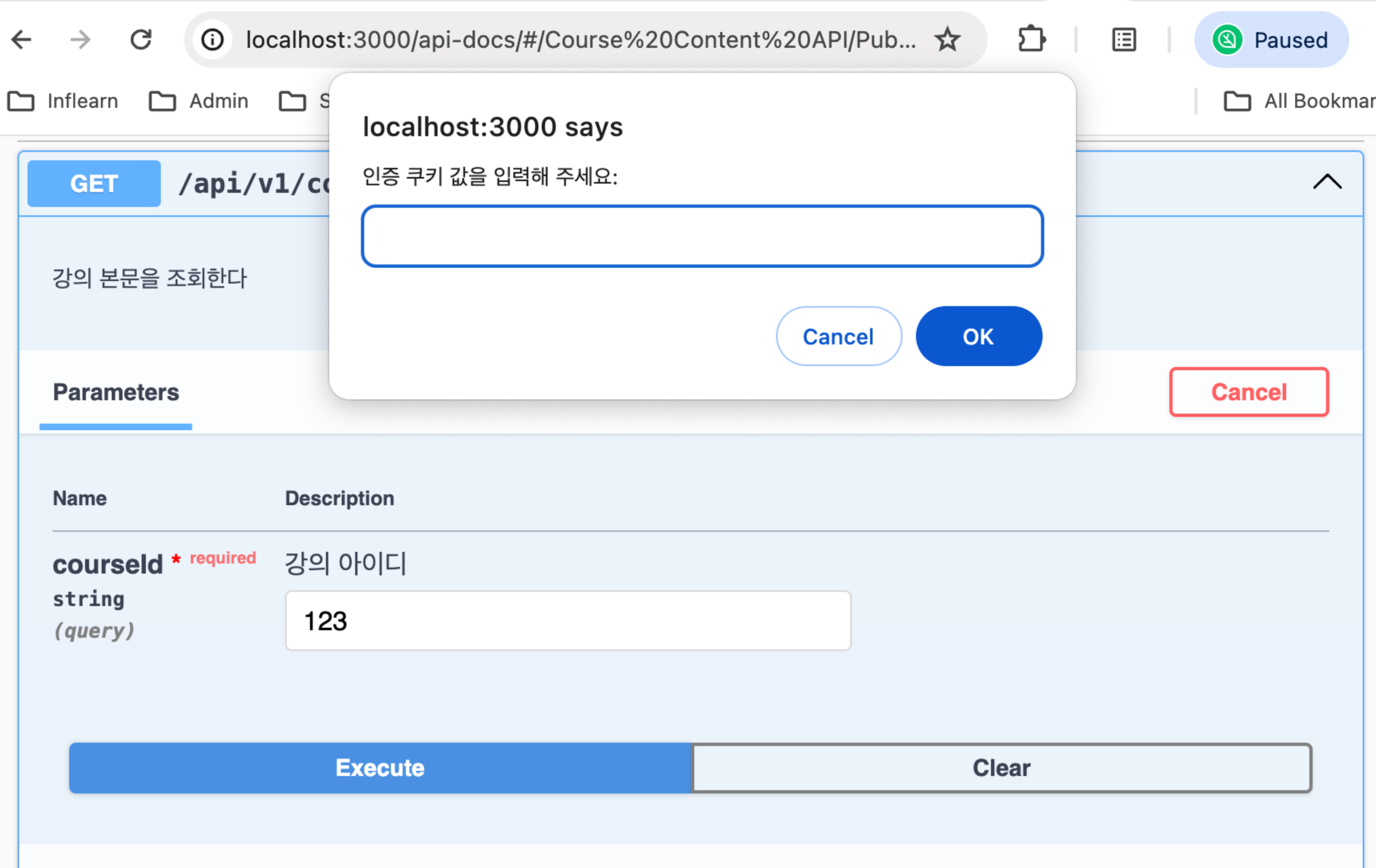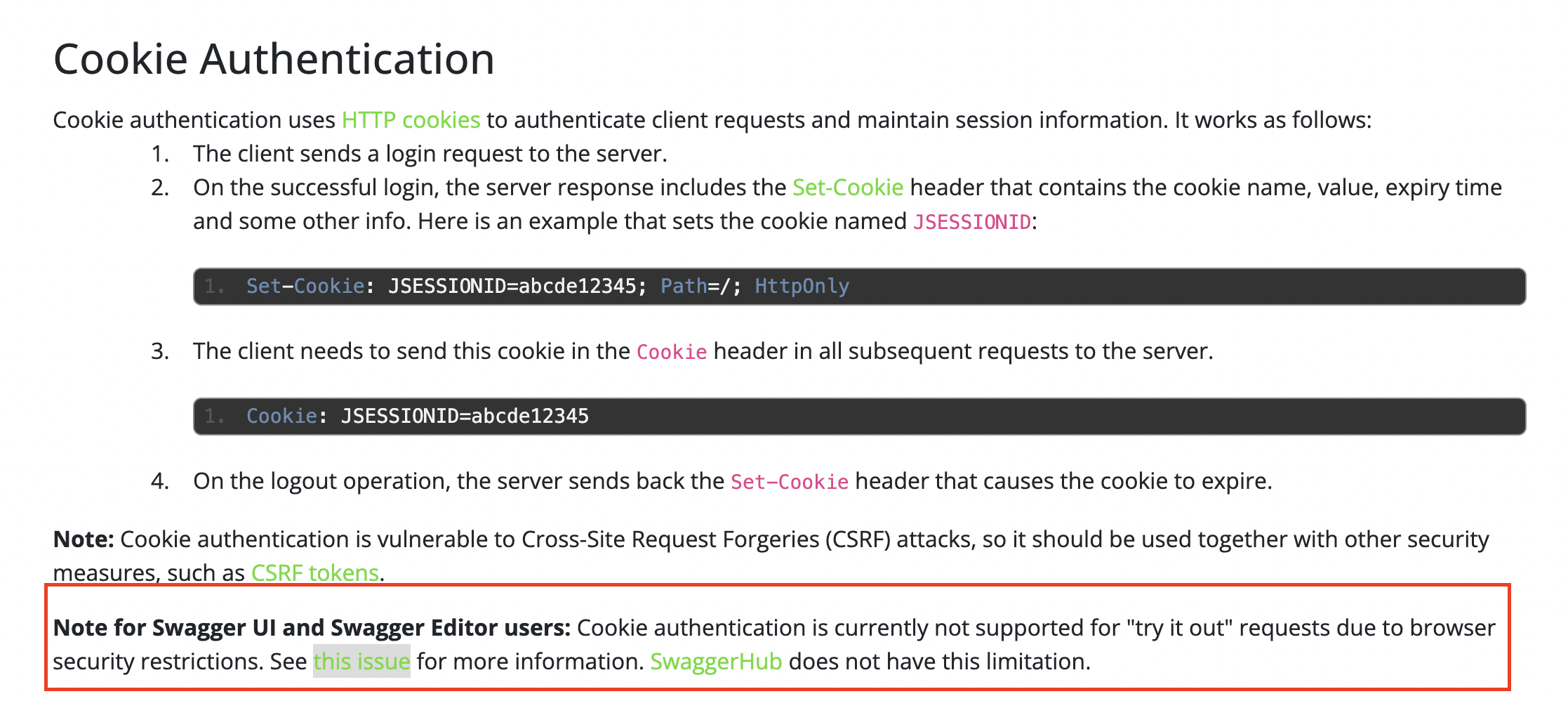 Swagger UI 의 Try it out 기능에서는 보안상의 이유로 쿠키 설정 기능이 제공되지 않습니다.