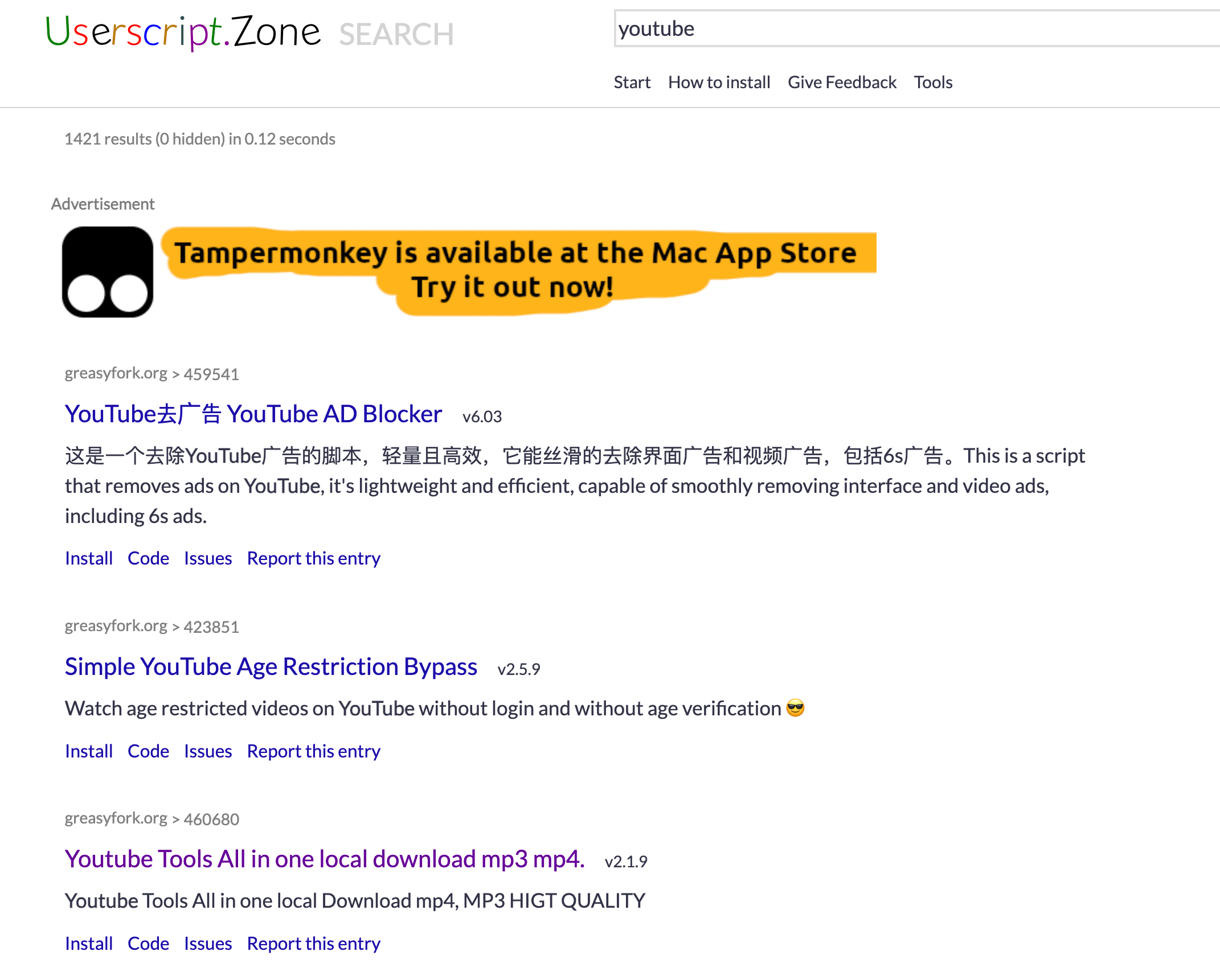 UserScript.zone 에서 "youtube" 를 검색한 결과
